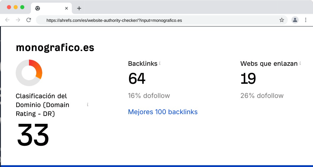 La imagen generada a través del Website Authority Checker de Ahrefs muestra las métricas principales del dominio analizado, en este caso, monografico.es. A continuación, se analizan los datos y el diseño proporcionado por la herramienta.