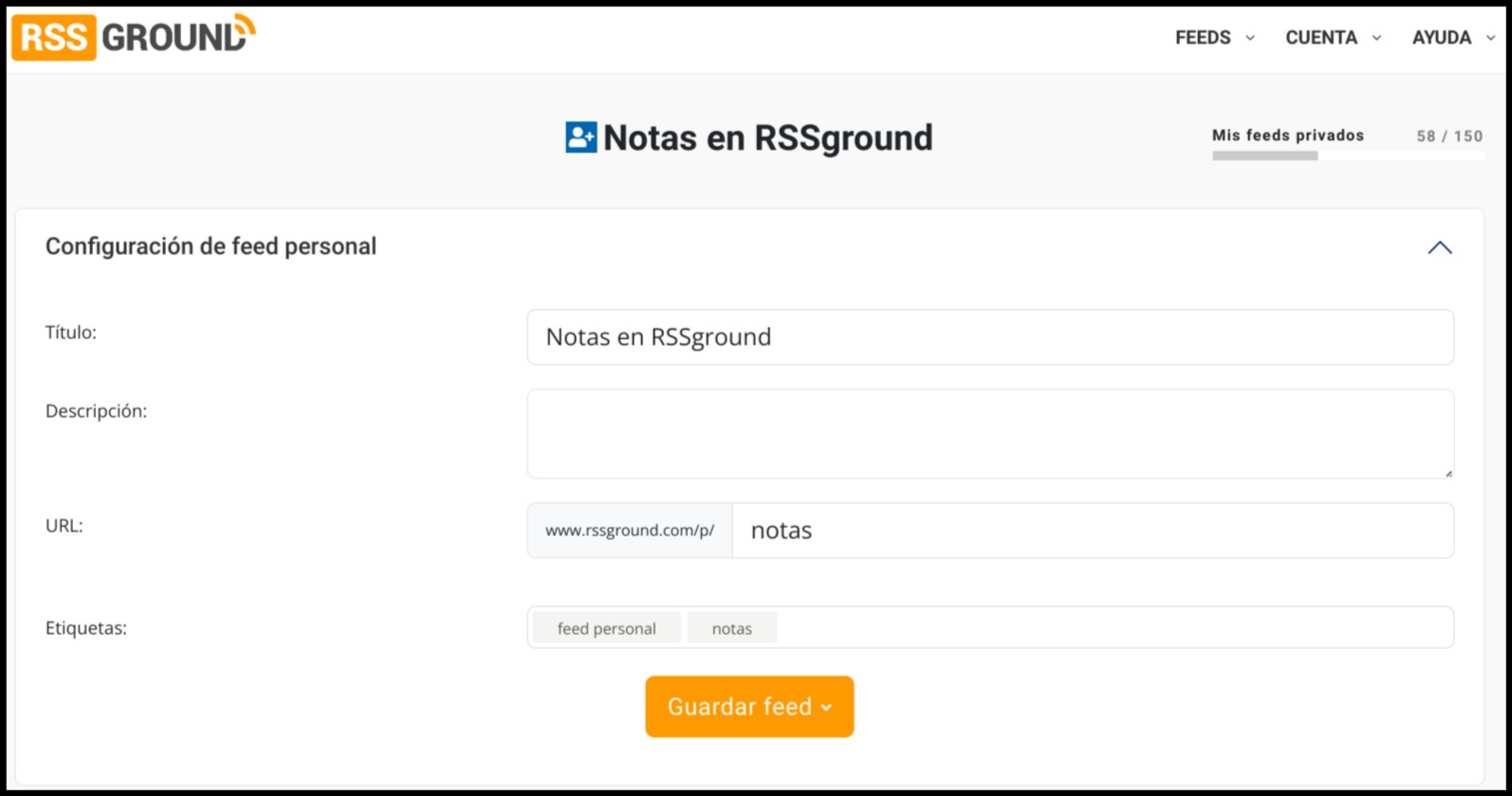 Configura tu feed personal con título, descripción, URL [www.rssground/p/NOMREdeFEED] y etiquetas.