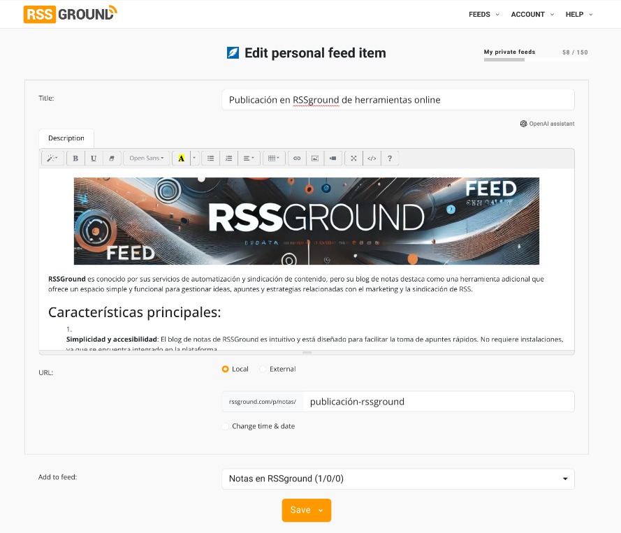 - Un menú desplegable para seleccionar el feed al cual se añadirá la publicación. En este caso, el feed seleccionado es “Notas en RSSGround”.