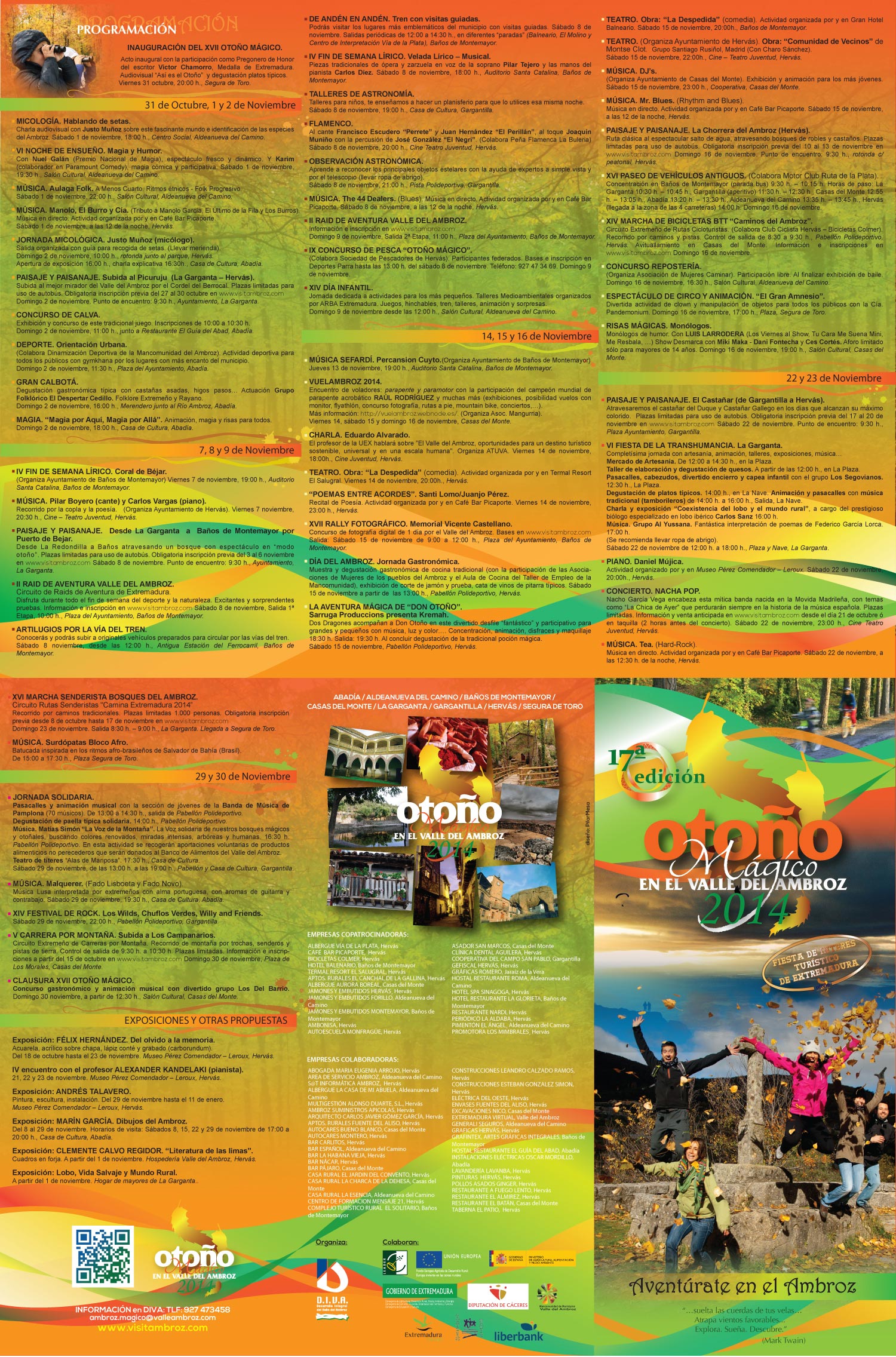 La comarca cacereña del Valle del Ambroz se prepara un año más para vivir su ‘Otoño mágico’ con medio centenar de actividades que se desarrollarán a lo largo de cinco fines de semana en las ocho localidades de la zona, donde residen unas 8.000 personas y que el año pasado recibió la visita de 22.000 turistas en esta época. Ampliar foto Para disfrutar de la naturaleza se han programado rutas senderistas, en bicicleta de montaña, un raid de aventura, concursos de fotografía, degustaciones gastronómicas, obras de teatro y un concierto de Nacha Pop que tendrá lugar en el Cine Juventud de Hervás el 22 de noviembre a las 23,00 horas.