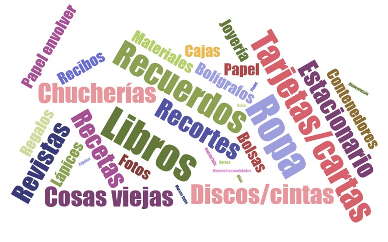 Figura 1 Nube de palabras de objetos coleccionados. Nota: Elaboración propia a partir de (Mogan, et al., 2012)