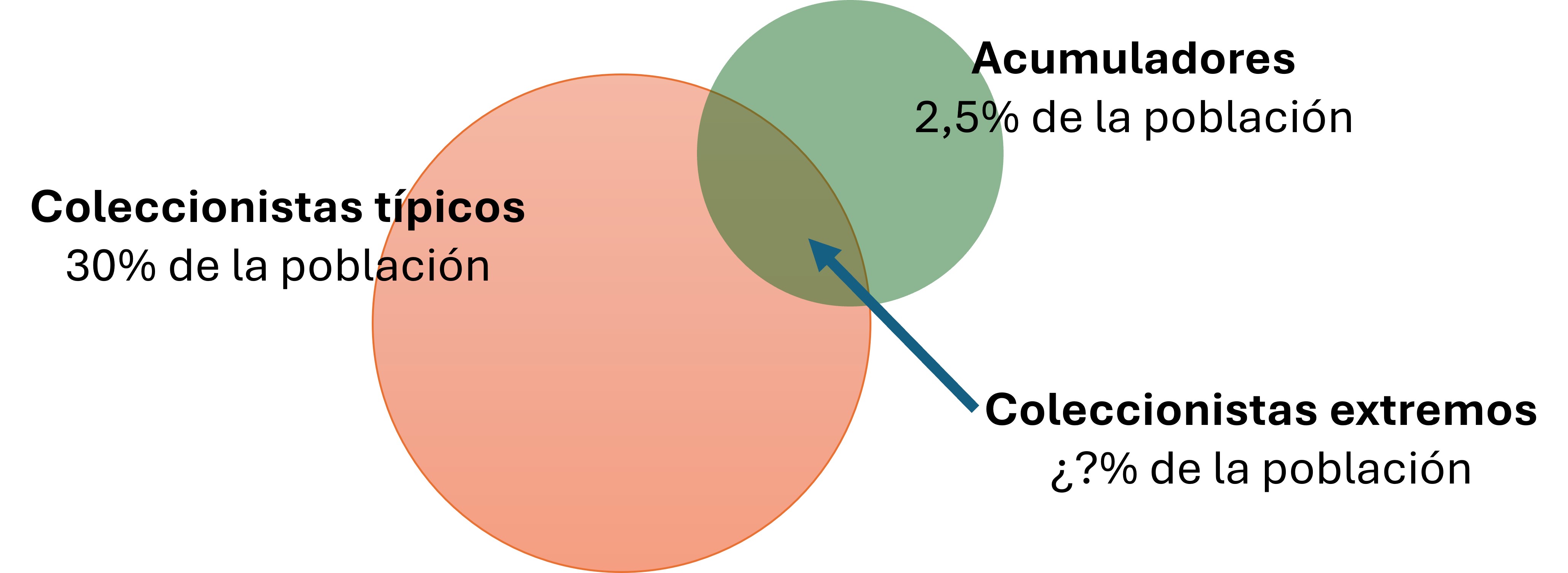 Es por tanto importante diferenciar Acumulación Patológica frente a Coleccionismo Normal, lo cual nos ayuda a detectar los falsos positivos y a evitar la sobrepatologización de esta actividad humana tan extendida que, según Nordsletten y Mataix-Cols (2012), como muestra la figura 2, puede extenderse al 70% de la población. El coleccionismo refleja muchas de las características centrales de la acumulación (por ejemplo, la adquisición y el apego emocional a un número potencialmente grande de objetos), es muy frecuente y generalmente se considera una forma normativa de acumulación de objetos. En la mayoría de los coleccionistas se descarta el diagnóstico de Trastorno de Acumulación. Sin embargo, para una minoría de coleccionistas “extremos”, que según los mismos autores no podemos determinar en tamaño poblacional, el diagnóstico de trastorno de acumulación, que señalan afecta a un 2,5% de la población, puede ser adecuado.
