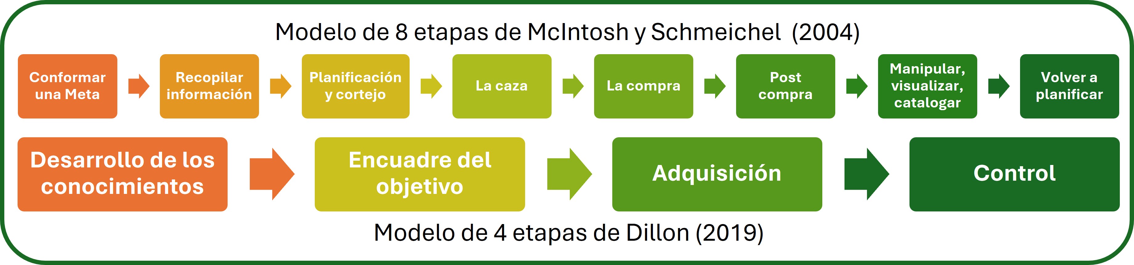 Más recientemente, Dillon (2019), plantea un modelo más simple, de 4 etapas. La primera, el desarrollo de los conocimientos, mediada por la fascinación por determinados objetos, sus orígenes, diferencias y cualidades, que llevan al estudio o la discusión con otros, es una motivación importante. La segunda, el encuadre del objetivo, en la que la colección crece por cambios cualitativos, desde el conocimiento adquirido a la estimación específica al adquirir algo, los costes, y el contexto de relación con quien vende. La tercera, la adquisición, que puede ser la etapa más rápida de un largo proceso de desarrollo de conocimientos previos y de fijación de objetivos y que orienta para calcular el valor en el mercado. Finalmente, la cuarta, el control, referida a los procesos de catalogación, exposición o manipulación y que puede implicar el almacenamiento o la venta. Podemos ver una comparación visual de este modelo, con el anteriormente descrito, en la figura 4.