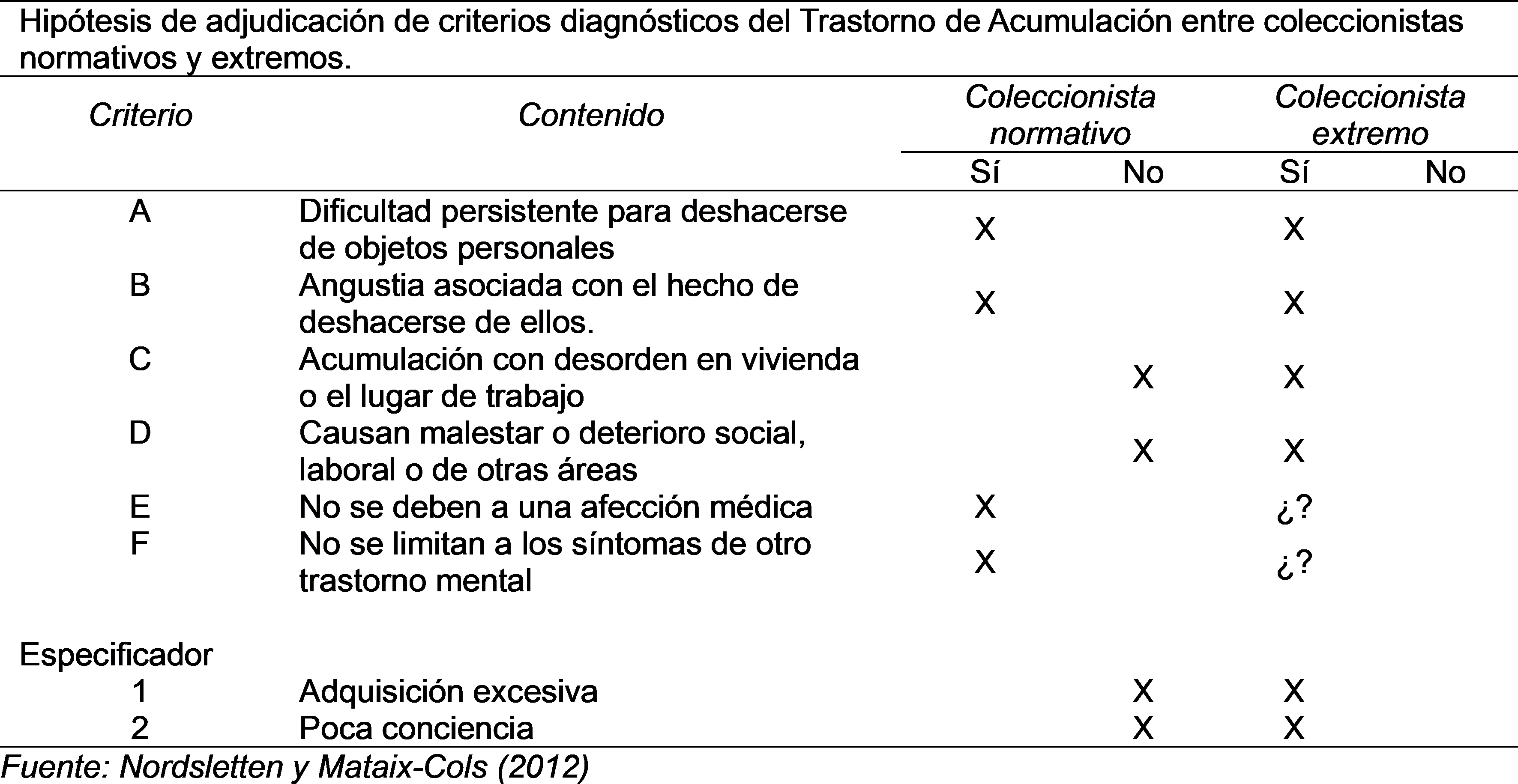 Parece que las fronteras entre la acumulación y el coleccionismo se definen en un campo intermedio que ocuparían lo que Nordsletten y Mataix-Cols (2012) denominan Coleccionismo Extremo. En la tabla 1 apreciamos que, tomando como base los criterios diagnósticos de la DSM-5, aparecerían diferencias entre el coleccionista normativo y el extremo.