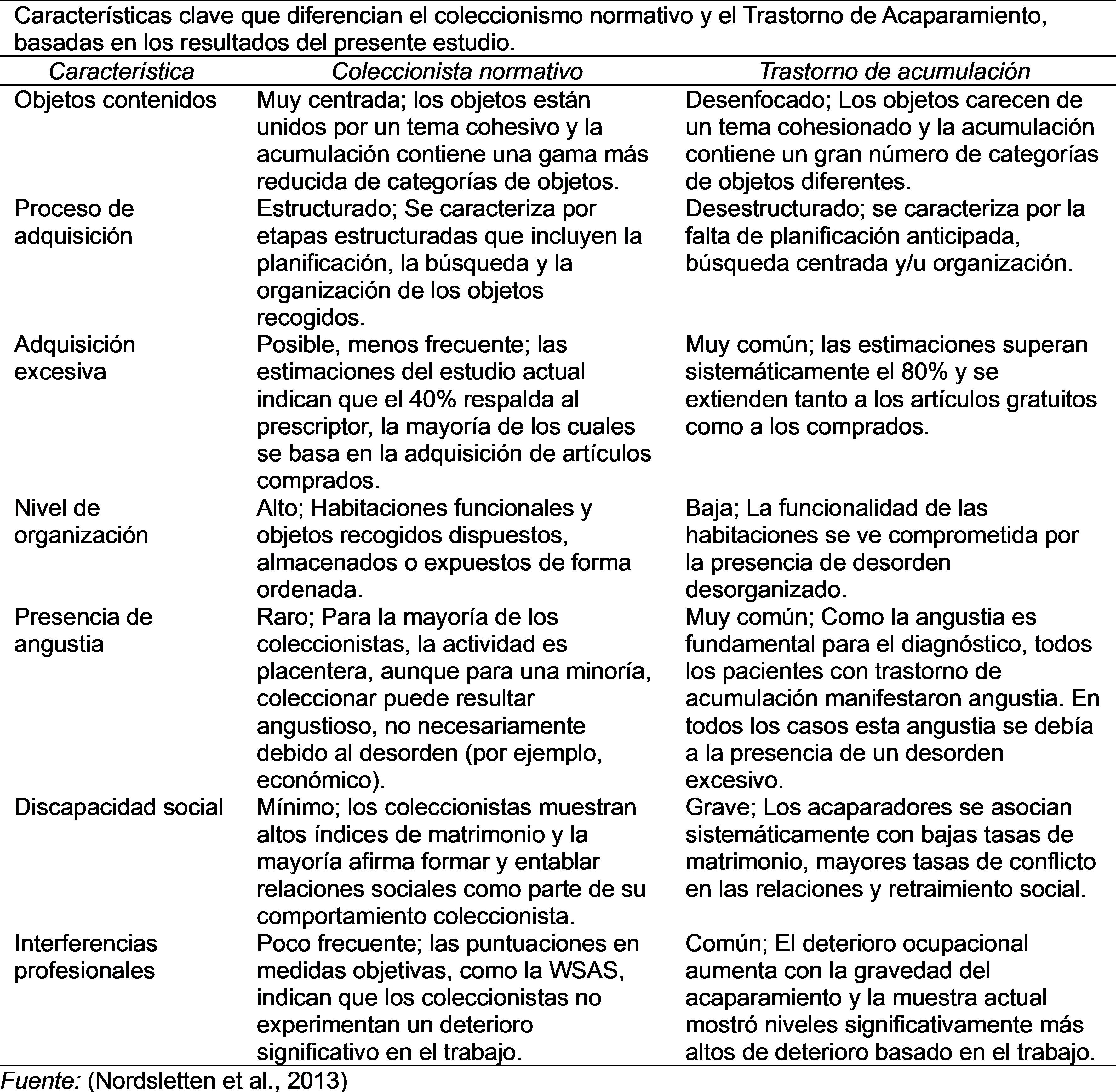 El equipo de Nordsletten y sus colaboradores, aportan una serie de claves para identificar a coleccionistas normativos frente a las personas con un trastorno de acumulación (Nordsletten et al., 2013. Podemos ver estas características en la tabla 2.