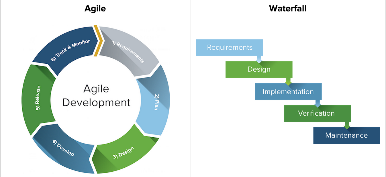 Debemos de hablar del método de implantación, los más usados son agile y waterfall: