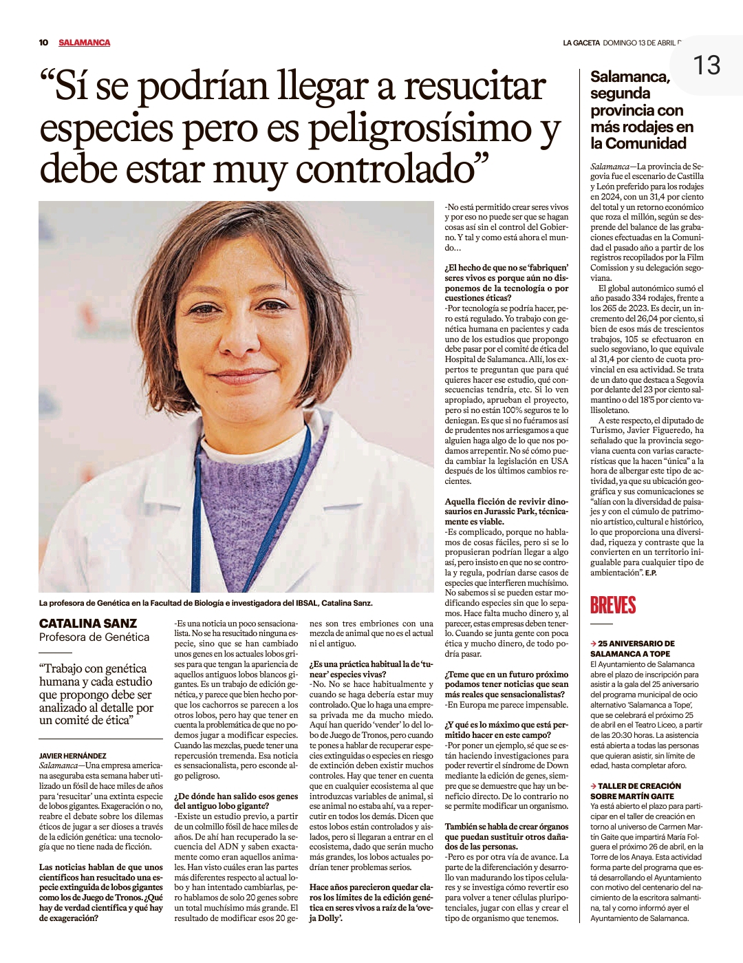 Entrevista de La Gaceta de Salamanca a la profesora de Genética de la USAL, Catalina Sanz