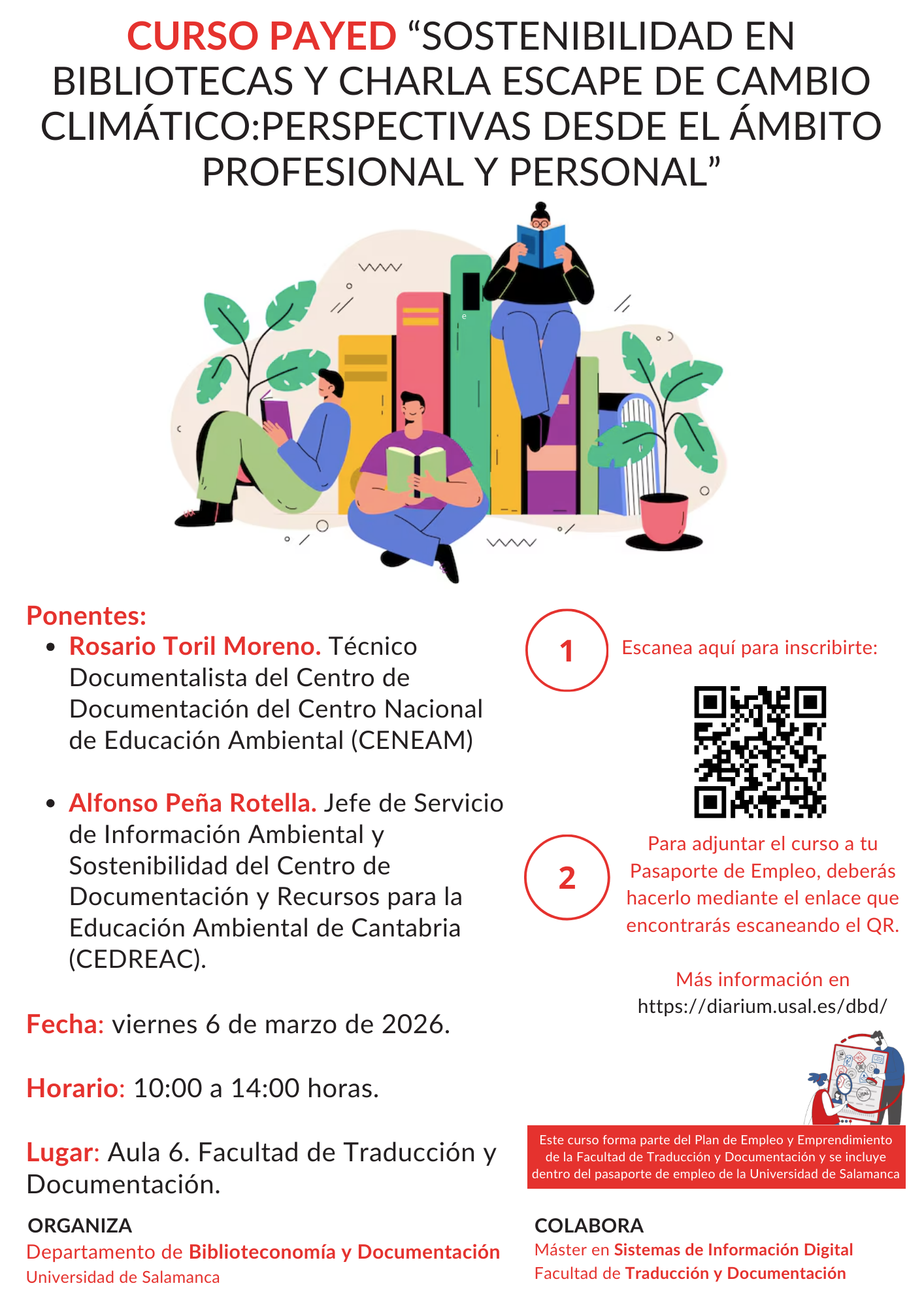 El viernes 6 de marzo de 2026, de 10:00 a 14:00 h, en el Aula 6 de la Facultad de Traducción y Documentación, tendrá lugar el curso: Sostenibilidad en bibliotecas y charla escape de cambio climático: perspectivas desde el ámbito profesional y personal, que será impartido por Rosario Toril Moreno, Técnico Documentalista del Centro de Documentación del Centro Nacional de Educación Ambiental (CENEAM) y Alfonso Peña Rotella, Jefe de Servicio de Información Ambiental y Sostenibilidad del Centro de Documentación y Recursos para la Educación Ambiental de Cantabria (CEDREAC).