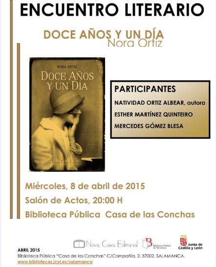 El próximo miércoles, 8 de abril, tendrá lugar la presentación de la nueva novela de Nora Ortíz Doce años y un día. El acto tendrá lugar en la Biblioteca “Casa de las Conchas” de Salamanca e intervendrán, además de la autora, la historiadora Esther Martínez Quinteiro y la ensayista y filósofa Mercedes Gómez Blesa.