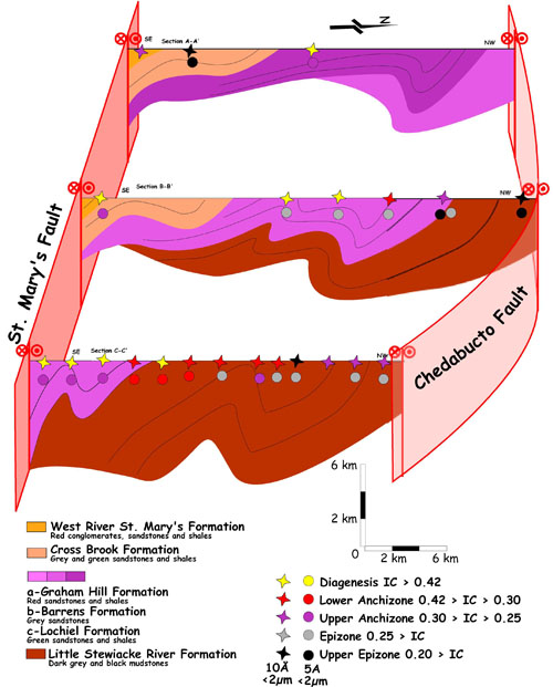The Late Devonian – Early Carboniferous St. Mary’s Basin in the Canadian Appalachians consists of Horton Group fluviatile and lacustrine clastic rocks. The basin occurs along the boundary between the Avalon and Meguma terranes and developed during coeval dextral shear along that boundary. X-ray diffraction reveals that the rocks contain ubiquitous quartz, K-white mica, and albite; illite–smectite mixed layers and chlorite are very common and Na–K mica, kaolinite, chlorite–smectite mixed layers, K-feldspar, berthierine, and rutile occur in some samples. Crystal-chemical parameters of white mica indicate the pressure and temperature of mineral growth and discriminate between diagenetic, anchizone, and low-grade metamorphic processes. Ku¨bler index values measured in the 5 A° peak and the presence of chlorite–mica stacks are indicative of high-anchizone–epizone grades, with a crystallinity (crystal size and number of defects) that increases towards the Chedabucto Fault, which defines the northern margin of the basin. Ku¨bler index values measured in the 10 A° peak indicate that a late fluid-rich event could have produced the observed illite–smectite mixed layers. The overall clay-mineral content and the b-cell dimension of the K-white micas are typical of postdepositional evolution in extensional sedimentary basins with high heat flow (>35 8C/km). Taken together, our data record two superposed events related to deformation along the basin margins and coeval regional fluid flow, in which retrograde reactions at temperature T < 200 8C were superimposed on a pre-existing prograde assemblage typical of high-anchizone – lower greenschist-facies conditions (T > 300 8C). Regional syntheses indicate that this fluid flow may have occurred during episodes of Late Carboniferous dextral shear along the Avalon–Meguma terrane boundary.