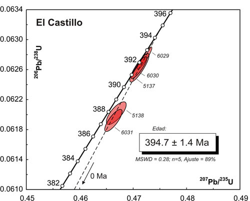 Exposures of volcanic rocks (El Castillo) in the Central Iberian Zone near Salamanca, Spain, are representative of Paleozoic volcanic activity along the northern Gondwanan passive margin. Alkaline basalts and mafic volcaniclastic rocks of this sequence are structurally preserved in the core of the Variscan Tamames Syncline. On the basis of the occurrence of graptolite fossils in immediately underlying strata, the El Castillo volcanics traditionally have been regarded as Lower Silurian in age. In contrast, most Paleozoic volcanic units in western Iberia are rift-related mafic to felsic rocks emplaced during the Late Cambrian-Early Ordovician, and are attributed to the opening of the Rheic Ocean. We present new zircon U-Pb TIMS data from a mafic volcaniclastic rock within the El Castillo unit. These data yield a near-concordant, upper intercept age of 394.7 ± 1.4 Ma that is interpreted to reflect a Middle Devonian (Emsian-Eifelian) age for the magmatism, demonstrating that the El Castillo volcanic rocks lie unparaconformably above lower Silurian strata.