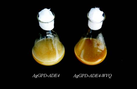 Un propiedad interesante que tiene Ashbya gossyppii y que no poseemos los humanos y el resto de mamíferos es la capacidad de sintetizar vitamina B2. Esta vitamina le confiere a los cultivos un color amarillo anaranjado como puede observarse en la imagen de arriba.