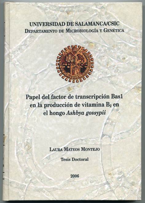 TÍTULO: Papel del factor de transcripción Bas1p en la producción de vitamina B2 en el hongo Ashbya gossypii. Doctoranda: Mateos Montejo, Laura. Programa de Doctorado: Microbiología y Genética Moleculares. AÑO: 2006. Calificación: Apto Cum Laude.