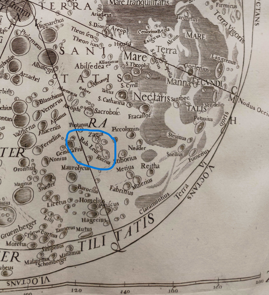 Al indagar el origen del nombre encontré que la UAI lo había tomado de un libro de Riccioli de 1651, donde aparece un mapa lunar elaborado poco después de la invención del telescopio (1608). Se refiere al libro Almagestum Novum (Vol I) de Giovanni Battista Riccioli (1598-1671), un jesuita italiano y prestigioso astrónomo, que he consultado en en la Biblioteca General Histórica (BGH) de la Universidad de Salamanca. En la página 204 de este libro está insertada una hoja desplegable, de un tamaño equivalente a cuatro hojas normales, que incluye un mapa lunar del que se específica que el cartógrafo es F. M. Grimaldi y la nomenclatura es del autor del libro (G. B. Riccioli). Allí aparece escrito Zagut y no Zacut. Riccioli cita como fuente De motu octauae sphaerae (1521) de Augustinus Riccius un judio converso que conoció a Zacut y lo tradujo directamente desde el hebreo al latín. En este texto que está en la BGH aparece escrito Abraham Zacuth que, junto con Zacut y Zacuto, es la forma usual de citarlo en formas latinizada. Luego el origen de que el cráter se llame Zagut y no Zacut se debe a un error de transcripción cometido por Riccioli en 1651
