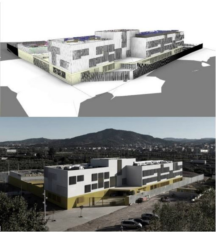 Arriba. Gemelo digital del Instituto Lluis Requesens en Molins de Rei (Barcelona, España). Abajo. Edificio real del Instituto Lluis Requesens. Primer Proyecto BIM de infraestructures.cat.
