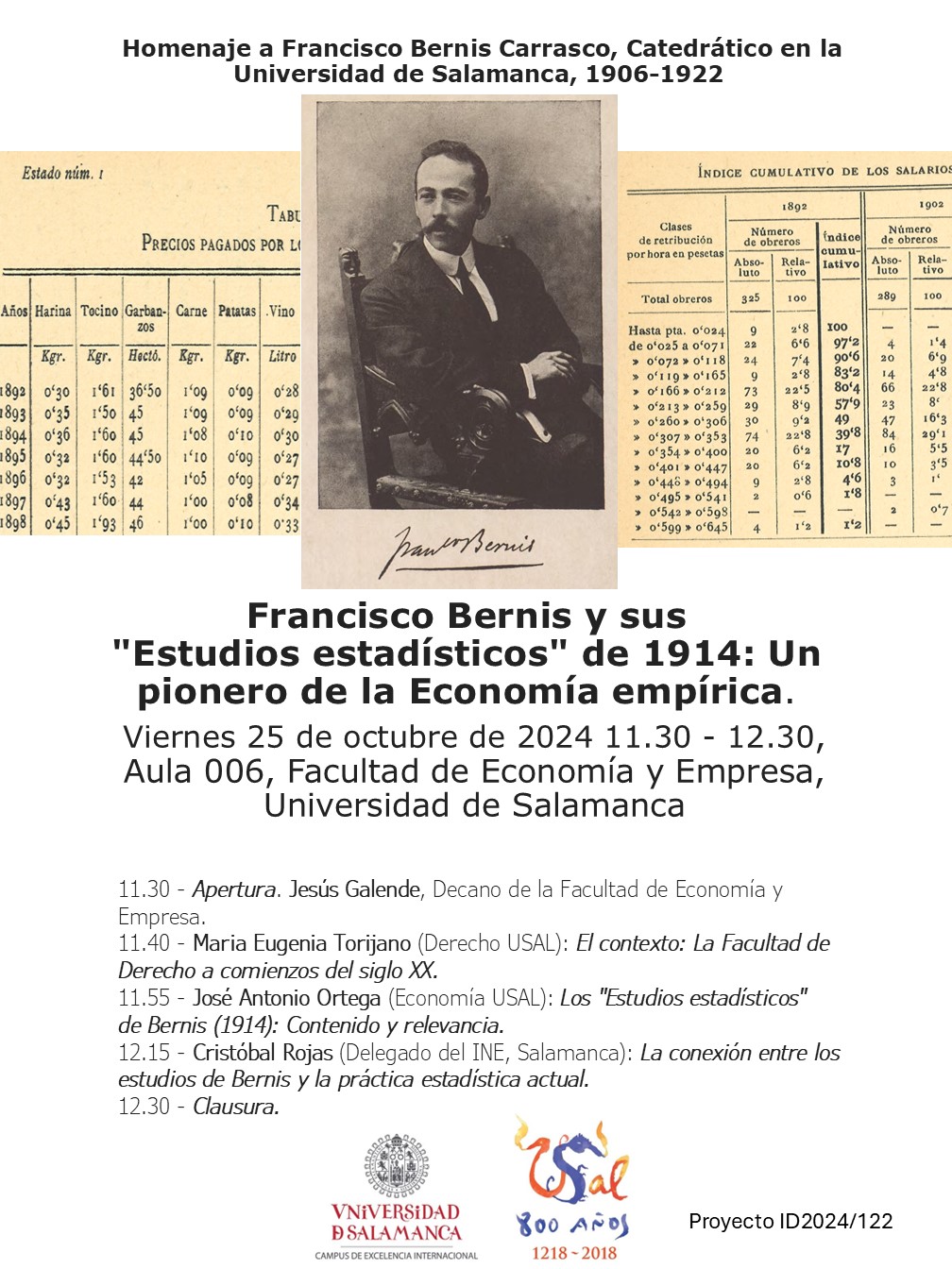 Esta sesión homenaje se enmarca en el Proyecto de Innovación Docente ID2024/122, “Recuperando a Bernis”. En este proyecto los estudiantes actuales utilizan los materiales elaborados por Bernis y sus estudiantes en el aprendizaje de la estadística y la econometría. Con ello recuperamos no sólo un estudio olvidado con relevancia actual, sino también parte de la historia de la Universidad y de la ciudad de Salamanca.