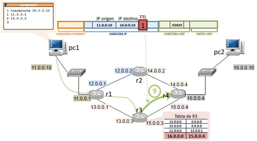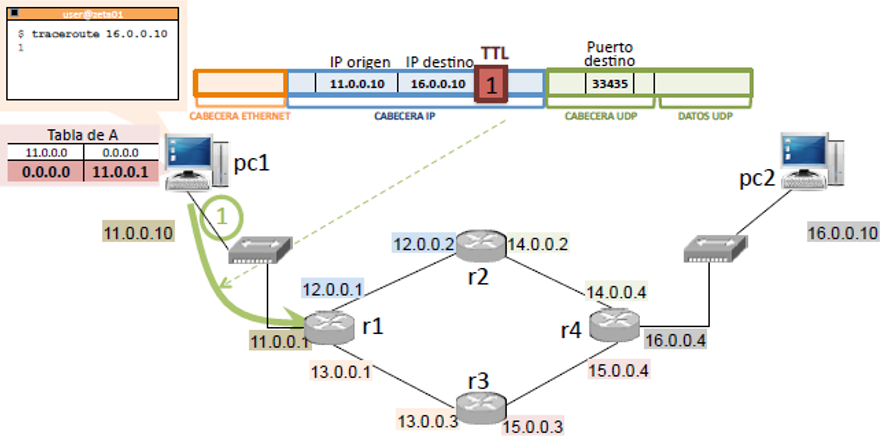 - pc1 envía un mensaje UDP al puerto 33435 (a un puerto donde no es espera encontrar ningún servidor UDP en ese puerto) encapsulado en un datagrama IP a pc2 con TTL=1 (traceroute envía por defecto 3 datagramas, pero lo veremos con 1 por simplicidad)