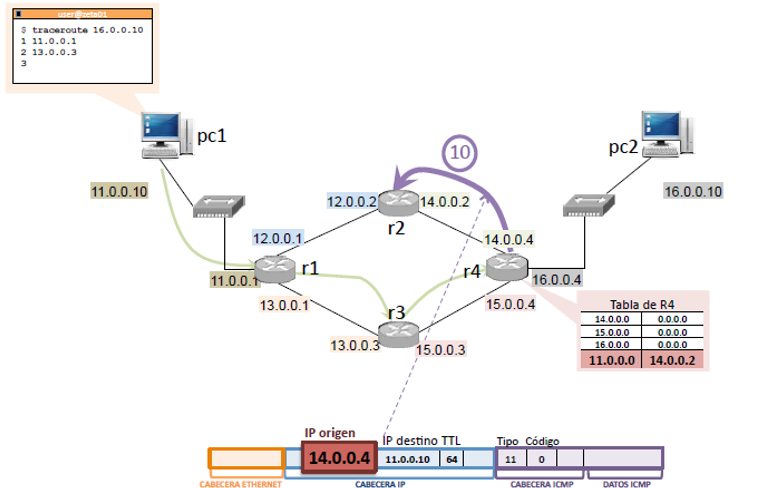 10. r4 envía un ICMP de TTL excedido al origen del datagrama, por la ruta que le indica su tabla de encaminamiento (¡por r2!)