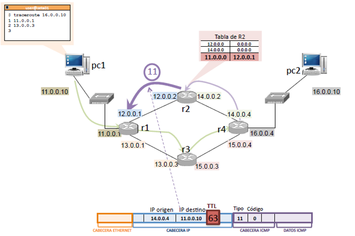11. r2 reenvía el ICMP hacia pc1 , tras disminuir en una unidad el TTL, por la ruta que le indica su tabla de encaminamiento