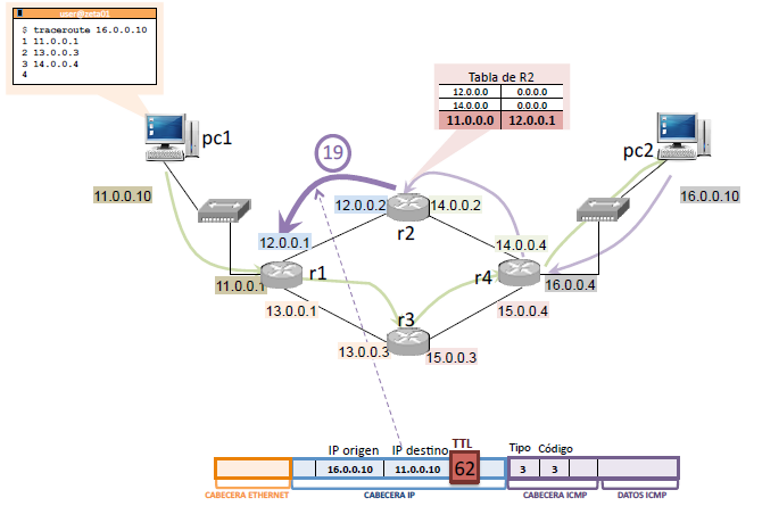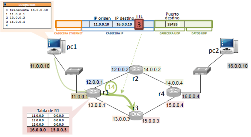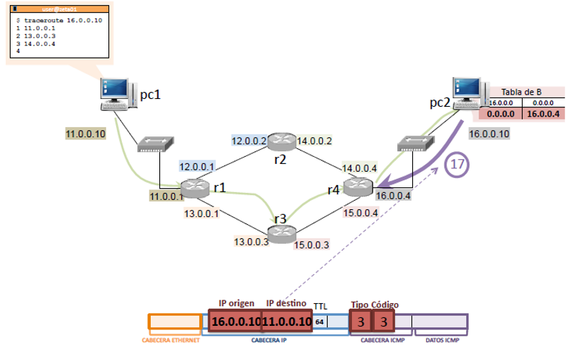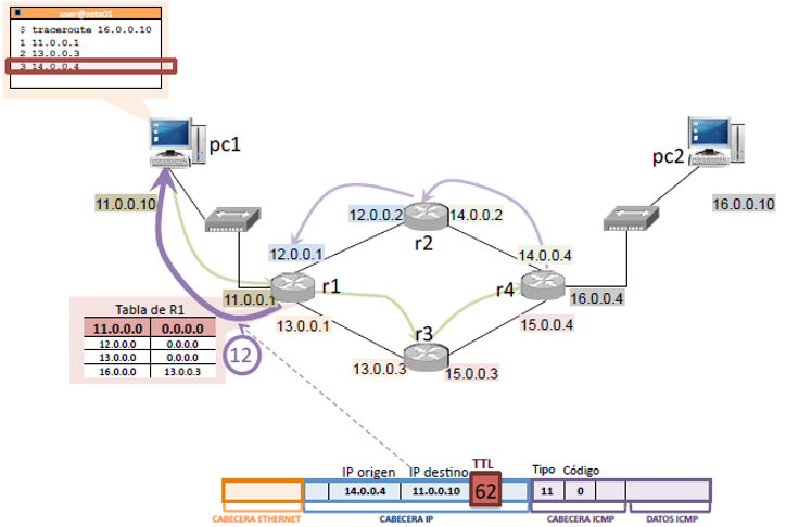 12. r1 reenvía el ICMP, tras disminuir en una unidad el TTL. pc1 muestra la dirección IP origen del ICMP recibido (r4) como tercer salto en el camino pc1 → pc2