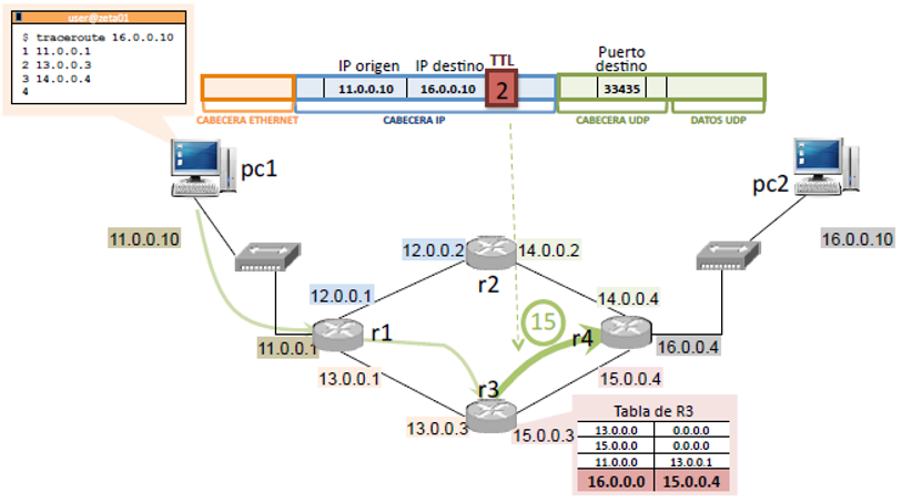 15. r3 disminuye en una unidad el TTL y lo reenvía hacia pc2 según su tabla de encaminamiento