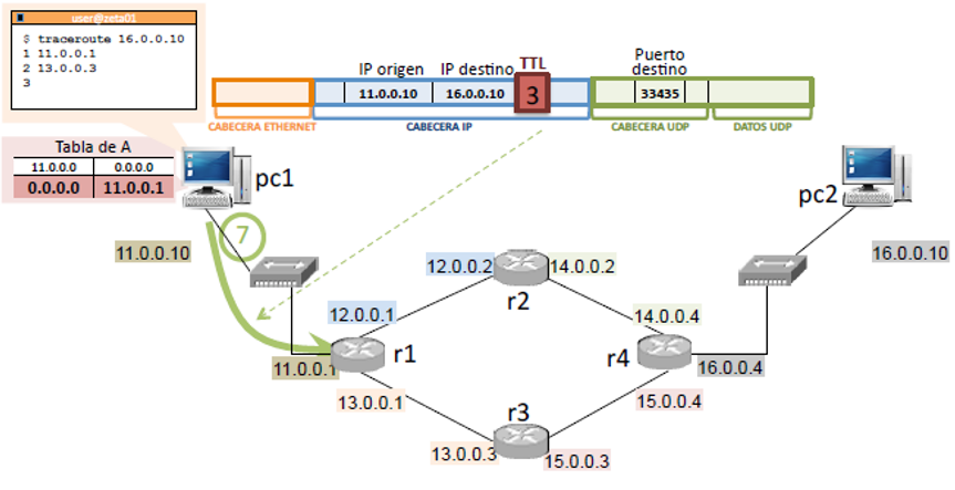 7. pc1 envía un mensaje UDP al puerto 33435 encapsulado en un datagrama al destino (pc2) con TTL 3