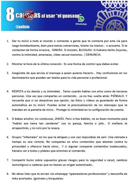 Todo se complica cuando la Policía Nacional, actualmente muy involucrada en las redes sociales publica en una de ellas “¿Cómo utilizar de forma segura el Whatsapp?”. Pero yo me pregunto, ¿usamos el Whatsapp de forma segura?