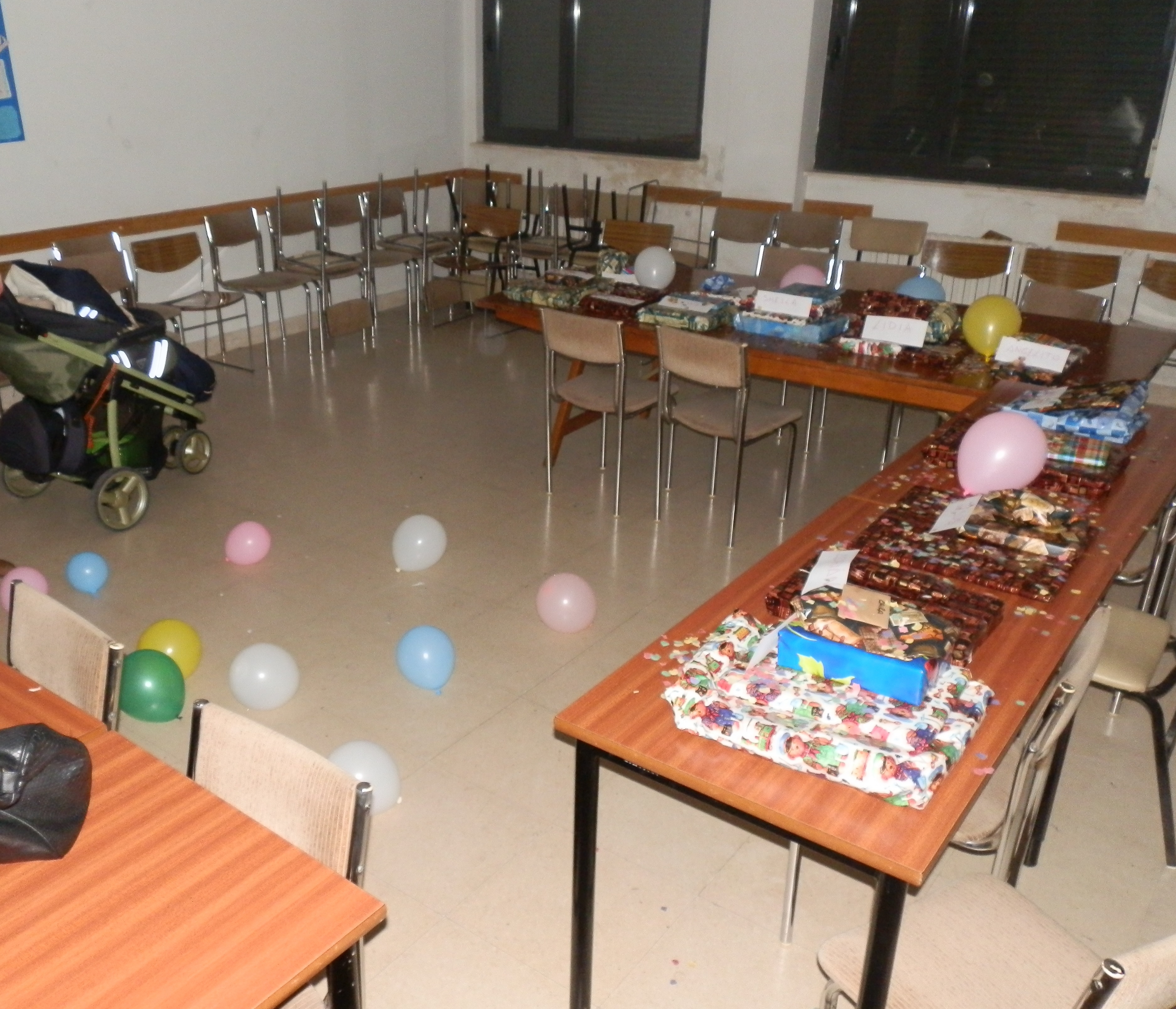 Llegó el día y solo aparecimos dos voluntarias. Tuvimos que pedir ayuda para hinchar los globos con los que íbamos a llenar la sala. Al final conseguimos poner cada montón de regalos cada una con un nombre a tiempo colocados en varias sillas que rodeaban toda la sala. Y todo lleno de globos. Ya estábamos preparados con todo apagado para la sorpresa.
