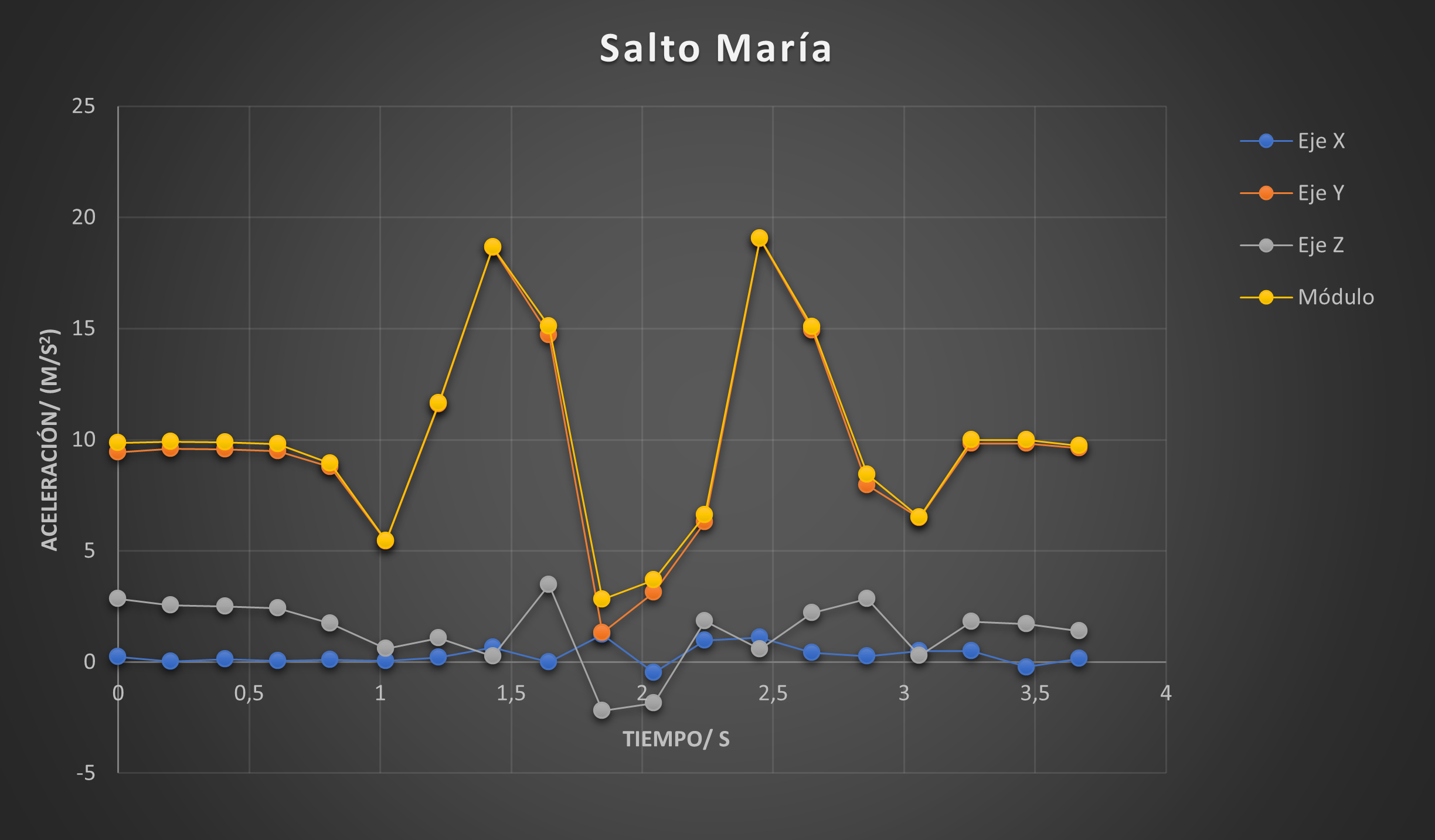 Justo antes de saltar, cogemos impulso flexionando las rodillas e inclinándonos ligeramente hacia abajo. Si atendemos al gráfico, el móvil registra este pequeño descenso. En el salto observamos como la aceleración es positiva y va ascendiendo hasta alcanzar un máximo. Acto seguido, al perder el impulso, la aceleración va disminuyendo hasta anularse en el punto más alto del salto. Desde ese momento se produce una aceleración negativa hasta alcanzar el suelo.