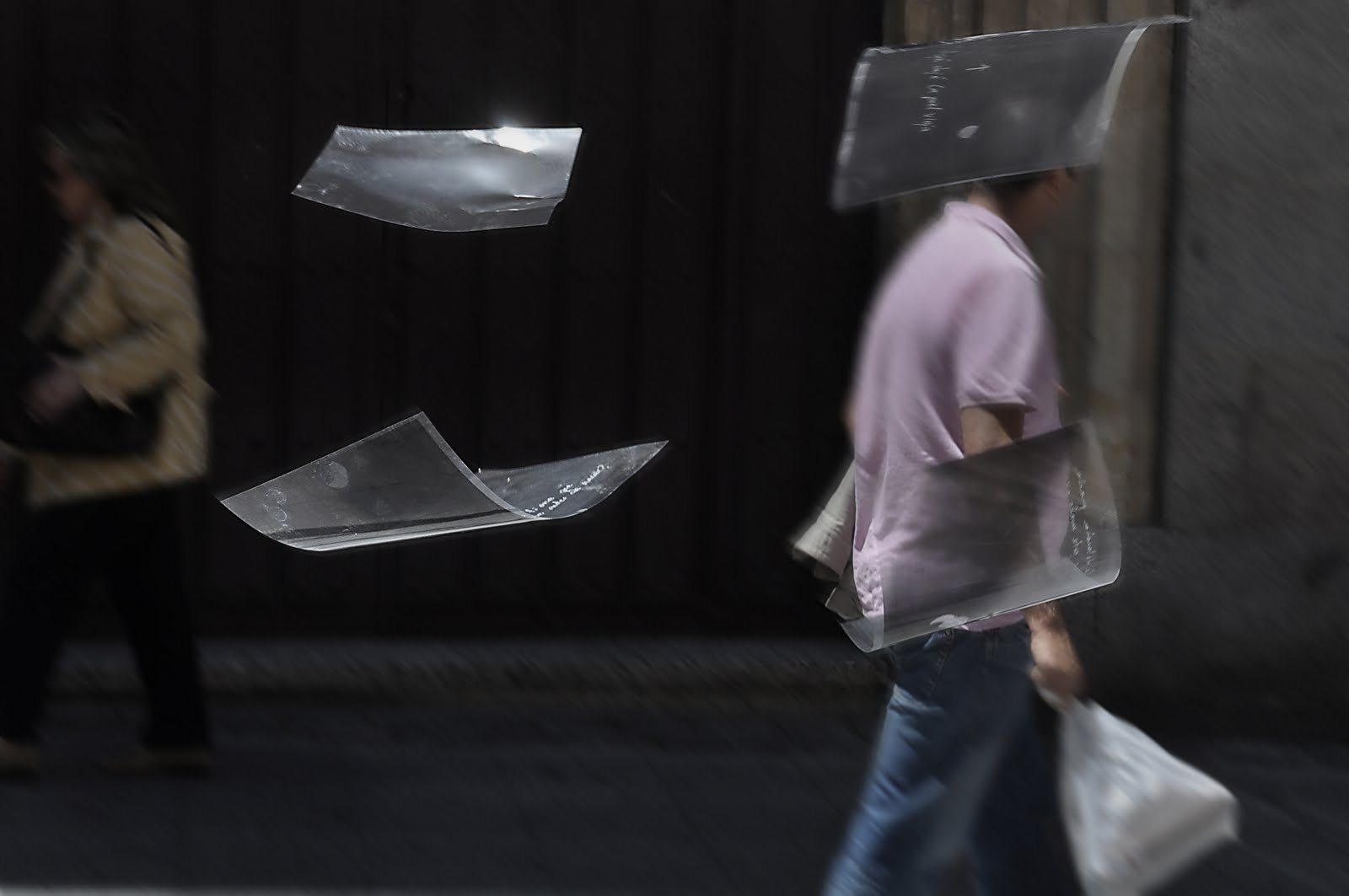 La acción comienza en la descomposición de dicha alfombra, la cual, origina el espectador, con sus pisadas y movimientos.