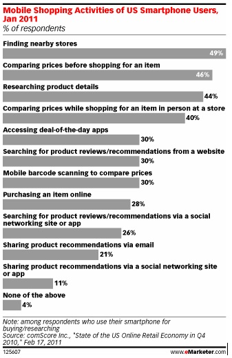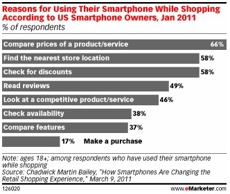 Y es que como se puede ver en las gráficas de más abajo procedentes de eMarketer, uno de los usos más importantes de los smartphones en el momento de la compra es la de comparar precios, opiniones…