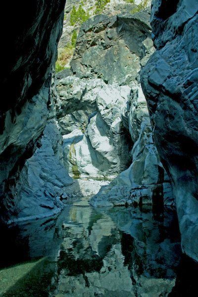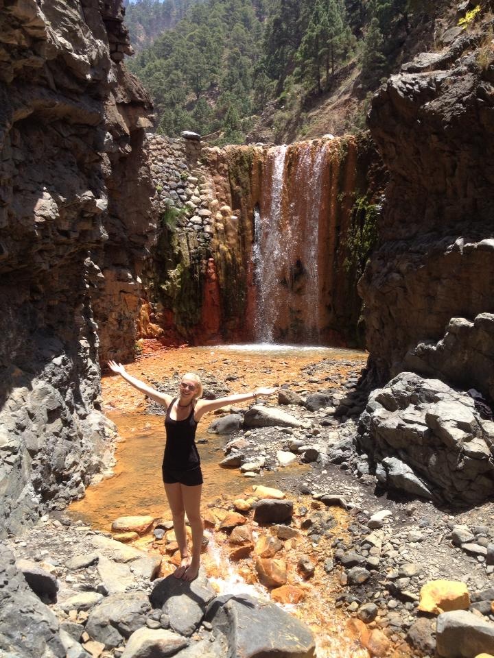 que el primero se resbale. Una vez superado éste llegamos a uno de los sitios más bonitos de la caldera: la Cascada de Colores que recibe su nombre debido a los diferentes colores que le dan los minerales del agua. De aquí se ve, además, el famoso pico Roque Idafe. A partir de aquí, comenzamos a bajar por el Barranco de las Angustias, aunque debido a que en muchas zonas el paisaje imposibilita pasar, es un tramo de constantes subidas y bajadas por las laderas del barranco pero paramos a descansar y a bañarnos varias veces en las piscinas naturales que ha formado la erosión. Finalmente, tras más de cuatro horas de ruta (sin contar los descansos) llegamos a nuestro destino: los aparcamientos donde dos días antes habíamos dejado los coches.