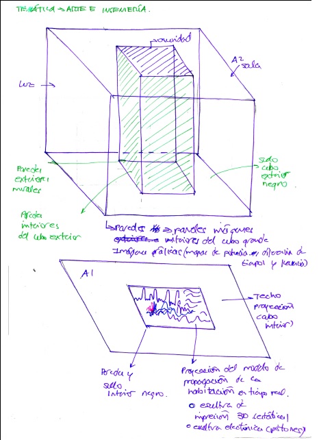 Lo más adecuado en este caso es la disposición de la instalación principal en una “Black Room”. La forma de este espacio será un ortoedro, de forma que no limite ni aporte nuevo significado a la instalación situada en su interior. (Véase en el plano, espacio rotulado A1).