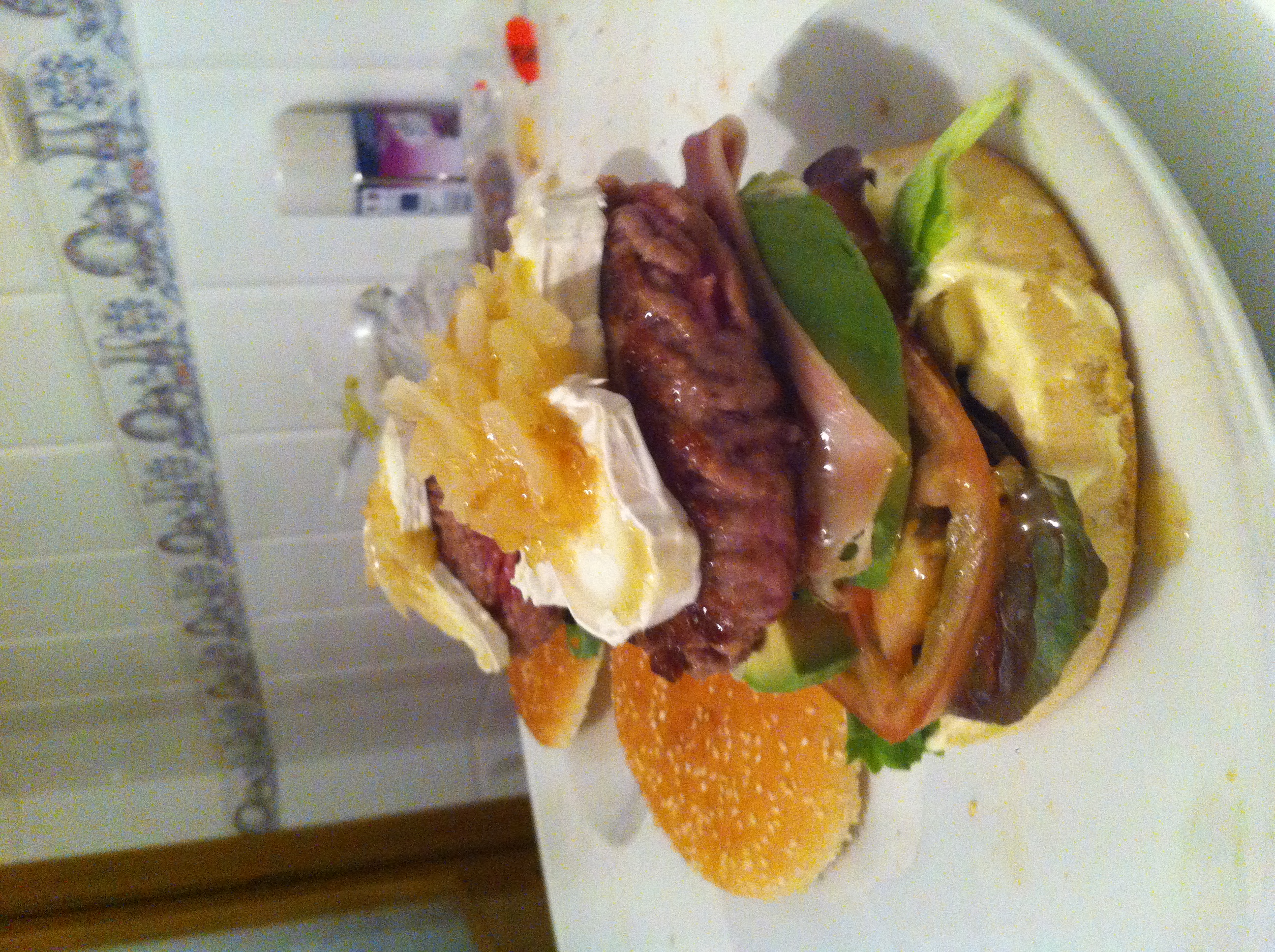 Esta sin duda es la más completa que he hecho , además de los ingredientes ya mencionados lleva : aguacate , jamón , queso de cabra y cebolla caramelizada.