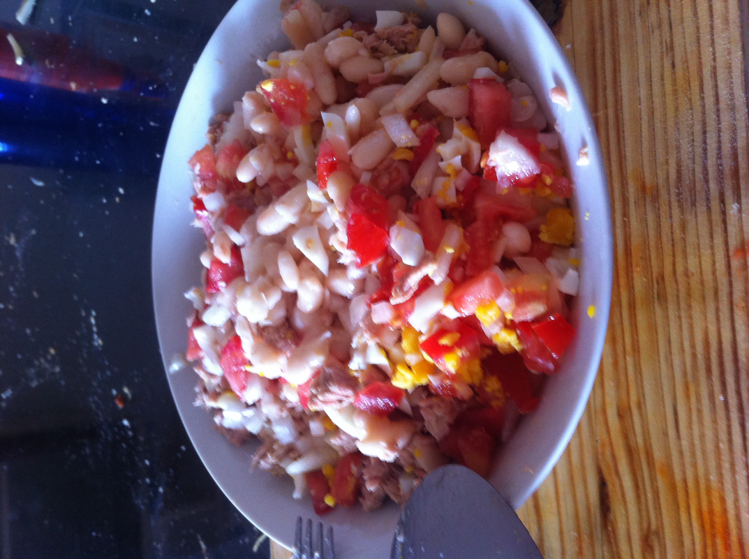 Esta ensalada lleva , habas , tomate , cebolla , huevo cocido y atún.