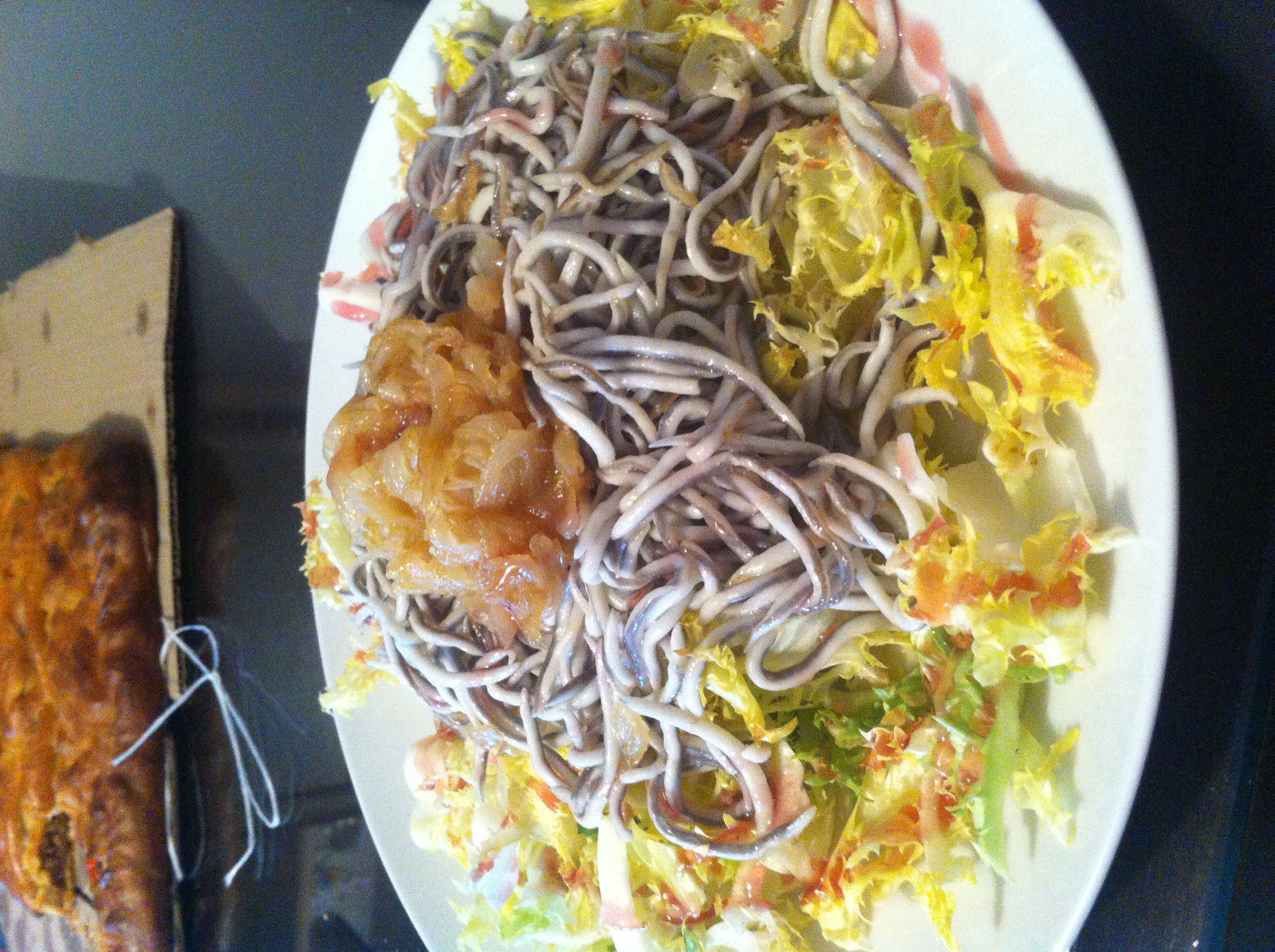 Esta ya es una ensalada un poco mas elaborada , lleva escarola , sofrito de ajo y gulas , cebolla caramelizada y sirope de frambuesa.