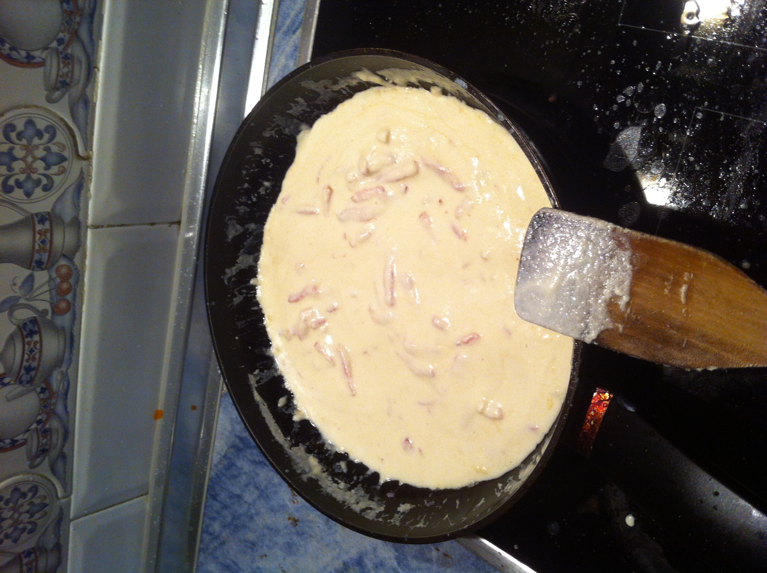 El segundo paso es preparar la salsa , en primer lugar en una sartén con un poco de aceite a temperatura media ,echamos el ajo ya picado , un par de minutos el bacon , cuando veamos que está cocinado echaremos la nata , y a fuego lento seguimos cocinando unos 5 min , acto seguido añadiremos el queso en polvo , prácticamente el paquete entero , con esto conseguiremos una textura más espesa para la salsa.