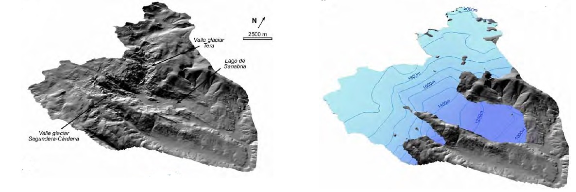 Comparativa entre la configuración actual del terreno y la reconstrucción 3D del aparato glaciar durante el máximo glaciar local (tomado de Rodríguez et al., 2011)