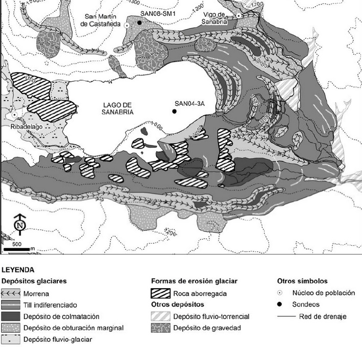 Mapa geomorfológico de detalle en el que se pueden observar los depósitos y formas glaciares del entorno del lago de Sanabria (Rodríguez-Rodríguez 2011)