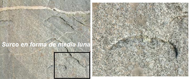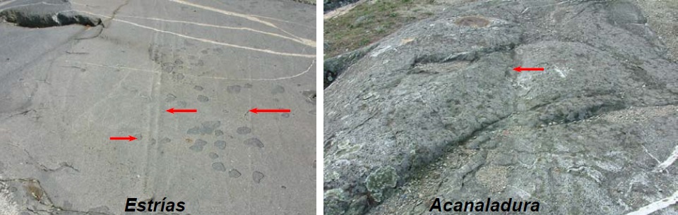 Podemos observar las marcas glaciares esculpidas sobre rocas aborregadas graníticas, formadas por la abrasión glaciar. Entre estas marcas se aprecian las estrías glaciares, producidas por la intensa acción erosiva la lengua glaciar al arrastrar material morrénico, y de las cuales se puede deducir la dirección del glaciar. También diferenciamos acanaladuras, formas en herradura o surcos en media luna, diaclasas….