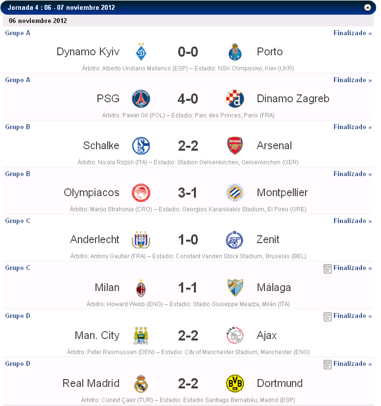 En el Bernabeu se enfrentaban el real Madrid y el Borussia el partido empezó con una primera parte pésima del real Madrid lo que llevo al primer gol de Reus ,esto hizo despertar un poco al Madrid que empato por medio de Pepe pero al filo del descanso un gol de Arbeloa en propia puerta hizo que el Dormund se adelantara. En la segunda parte el Madrid consiguió practicar su juego y casi al termino del partido özil consiguió el empate de libre directo.
